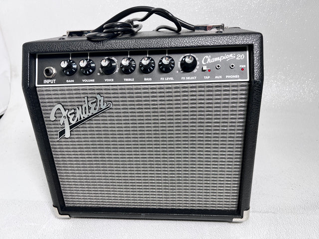 The Fender Champion 20 is a versatile combo amplifier that bridges the gap between practice and performance. This solid-state amp delivers 20 watts of reliable power through a single 8-inch speaker, making it suitable for bedroom sessions, small venues, and studio recording alike. Built into the Champion 20 is Fender's renowned onboard effects suite, including reverb, delay, and modulation options that let you explore different sonic textures without additional pedals. The amp's straightforward control layout—Volume, Tone, and Effects knobs—makes dialing in your sound intuitive, whether you're a beginner refining your tone or an experienced player seeking a compact backup rig. The used Fender Champion 20 represents excellent value for guitarists looking for authentic Fender tone and flexibility in a lightweight, portable package. Its durable construction and proven reliability make it a dependable choice for practice, gigging, or as a secondary amp in a multi-amp setup. Perfect for players who want professional-quality sound without the bulk of larger amplifiers.