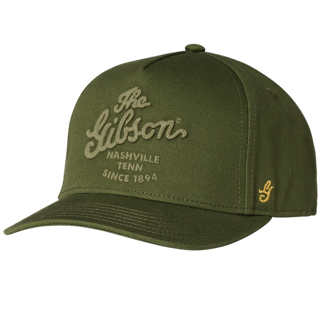 Gibson Script Logo Structured Snapback Olive Classic Gibson branding meets everyday versatility with this structured snapback cap. The iconic Gibson script logo is prominently displayed on the front, making it instantly recognizable to musicians and gear enthusiasts alike. The olive colorway offers a timeless, neutral tone that pairs effortlessly with any wardrobe while maintaining the heritage appeal Gibson fans expect. Built with a structured six-panel crown for a polished fit, this snapback delivers comfort and style whether you're at a gig, in the studio, or out and about. The adjustable snap closure ensures a customizable fit for all head sizes. Perfect for Gibson loyalists looking to rep their favorite brand with understated sophistication.